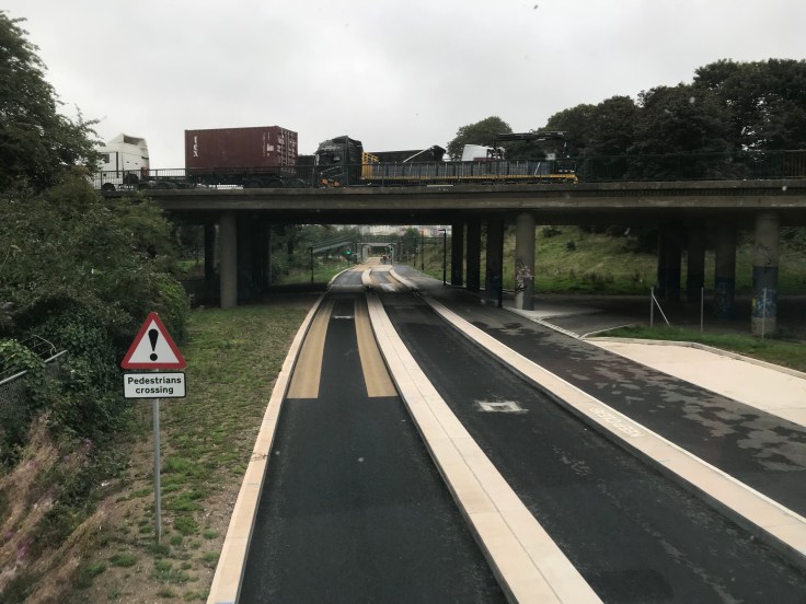 The busway has sections of guided track which, just like in Leigh in Greater Manchester, are completely unnecessary. I suspect it may be to do with getting grant funding from the DfT that required a certain percentage of route to be ‘guided’, if so it’s bureaucracy gone bonkers as it slows the bus down, costs more to build and operate when there’s no issue with available road width.
