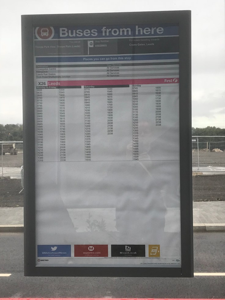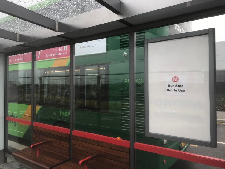 The previous stops (conveniently sited at the bottom of that deserted spine mall and the yet to open Odeon and gym) had a departure listing, but oddly the bus stop flags on either side of the road both indicated incorrectly buses would be heading to Leeds.