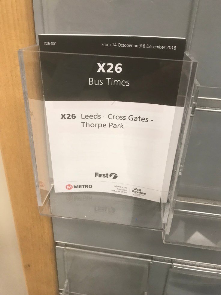 My biggest disappointment was the timetable leaflet for the brand new X26. I couldn’t get one on board the buses so on my return to Leeds wandered over to the METRO run Travel Centre in the bus station to see if there was one there.