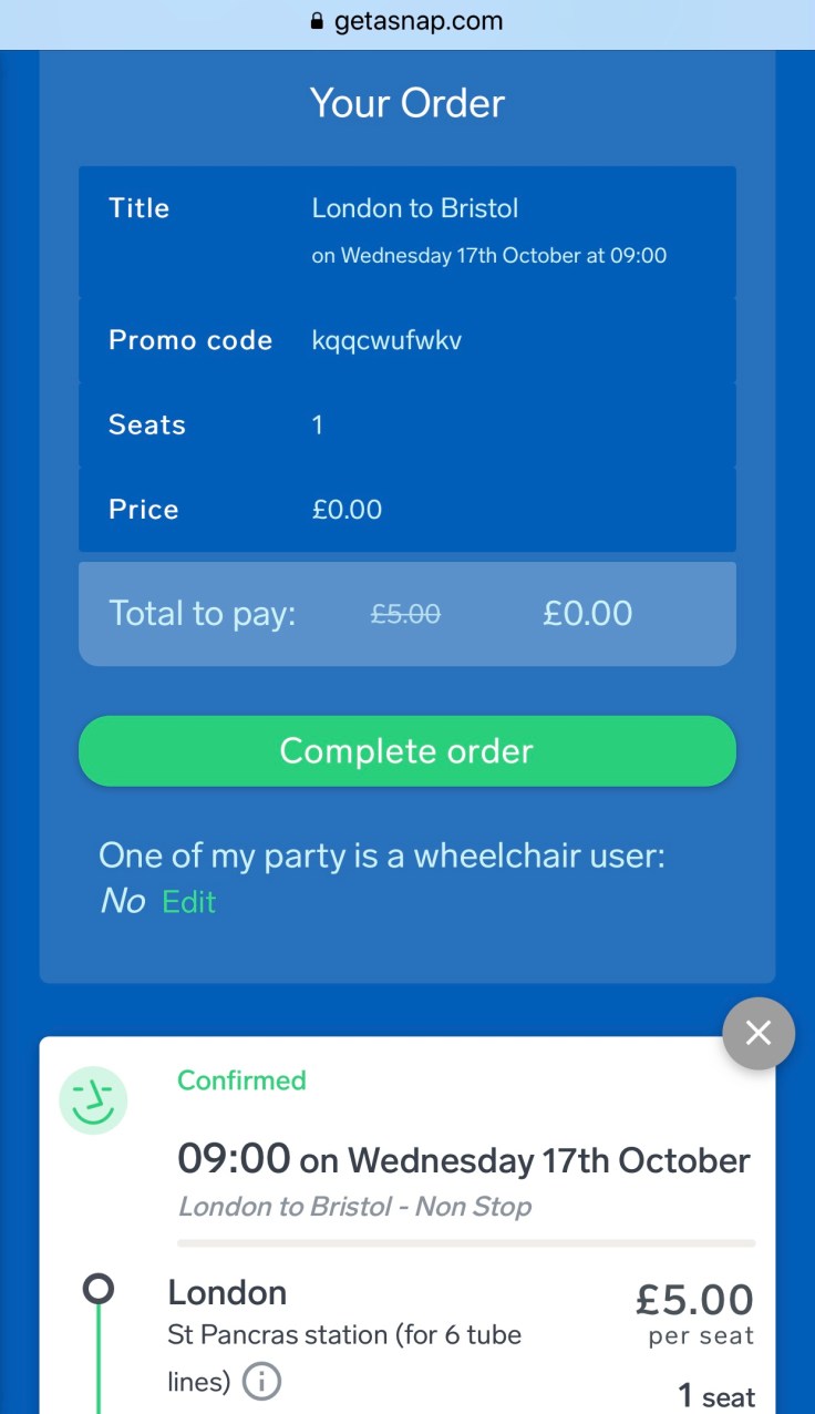This time Snap’s website had been updated to include a drop down menu in the From and To fields confirming all the available options which also now include Birmingham, Cardiff, Leicester and Worcester and even including journeys between them and not via London.
