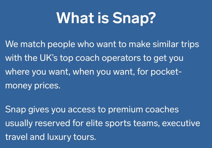 ‘Snap is premium inter-city travel, on demand, using the UK’s best independent coach companies. All for pocket money prices. Snap was founded in 2016 by Thomas Ableman, former Commercial Director of Chiltern Railways and Product Director of National Express and has carried over 100,000 people since launch, with outstanding customer feedback (9/10 on line reviews are 5-star).’