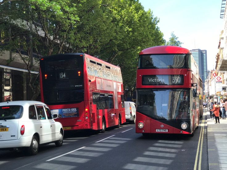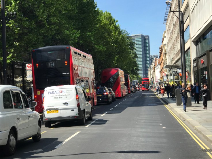 Some delays were evident at the junction with Oxford Street for right turning buses on the 73 and 390 (just one bus getting through each green phase) but southbound buses on the 14, 24 and 29 were gliding through, when able, with 134 buses easily turning left to their newly located terminal stand; all making for a refreshing change for central London buses.
