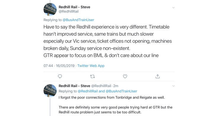 It’s noteworthy that the improved timetable south of East Croydon has by-passed poor old Redhill (literally) which now has a less attractive service than the pre 2012 ‘New Southern Railway’ version. Although they’ve gained through trains to Peterborough beyond London Bridge, they’re the stopping trains and there’s a perception Redhill has missed out on improvements.