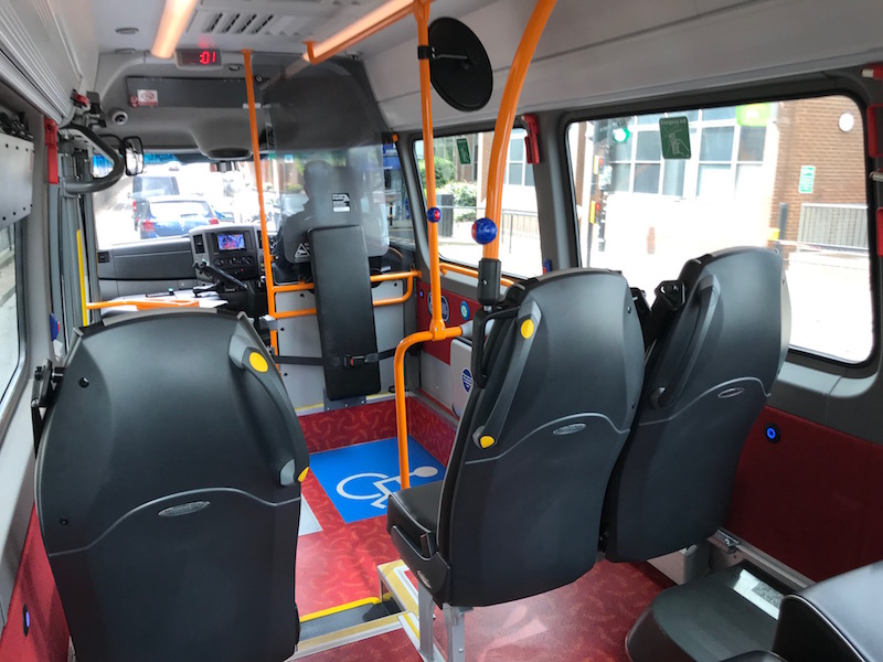 Otherwise the interiors are very similar to the Mercedes used in Oxford, Liverpool and Leicester with ten seats to the rear (including two over the wheel arches (for enhanced discomfort) and four tip-ups in the wheelchair/buggy area. USB sockets and wifi comes as standard, but you’re not really on the bus long enough to take advantage of these – even a journey from one side of the operating area to the other (my journey 2) only took 13 minutes.