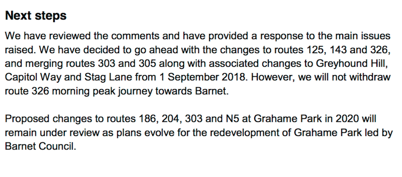 TfL issued a report on that consultation in June 2018 and confirmed many of the proposals including the extended route 125 and the merger of local routes 303 and 305 in the Edgware and Colindale area would be implemented on 1 September 2018.