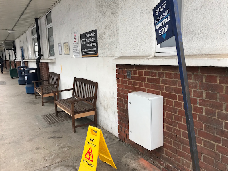 And sure enough I found what looked like a bus stop still proclaiming a “staff” inter site shuttle, complete with two handy benches to sit and wait and even a timetable on the wall. Great stuff. And this being a hospital the statutory ‘caution wet floor’ warning sign was properly in place too, even though it was obviously dry.