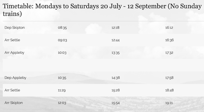 The three journeys leave Skipton at 08:35, 12:18 and 16:12 and just call at Settle then straight on to Appleby. Return times from Appleby are 10:35, 14:38 and 17:58. Journey time from Skipton to Appleby is around 75 minutes and if you come back on the next journey after the train has paused and had a good clean then you get about an hour in Appleby on the middle journey or half an hour on the other two.