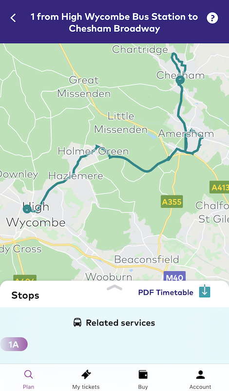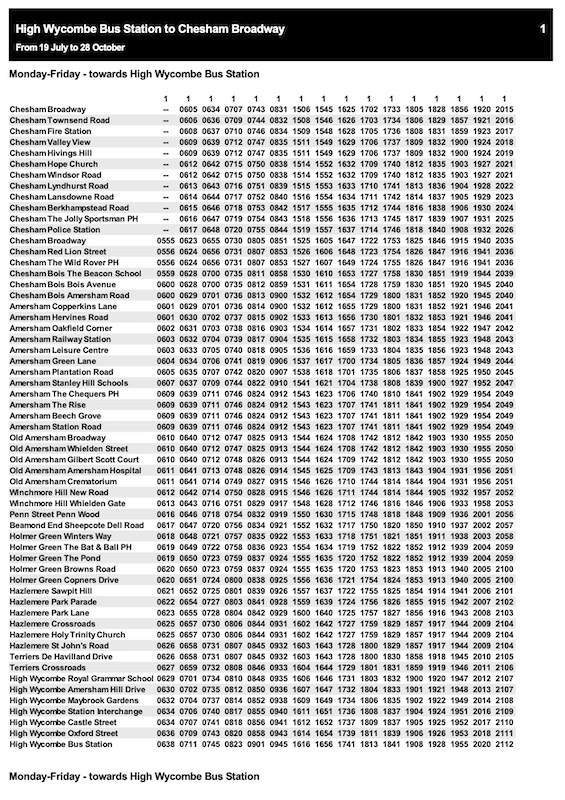Timetables are only shown strictly according to the route number you’ve picked. So, for example, if you click on route 1 Chesham and High Wycombe, this shows only those journeys numbered as route 1 with departures from Chesham Broadway at 06:05 through to 08:31 then nothing until 15:06 and then departures through until 21:15. Every stop is listed for good measure too, making for a long listing.