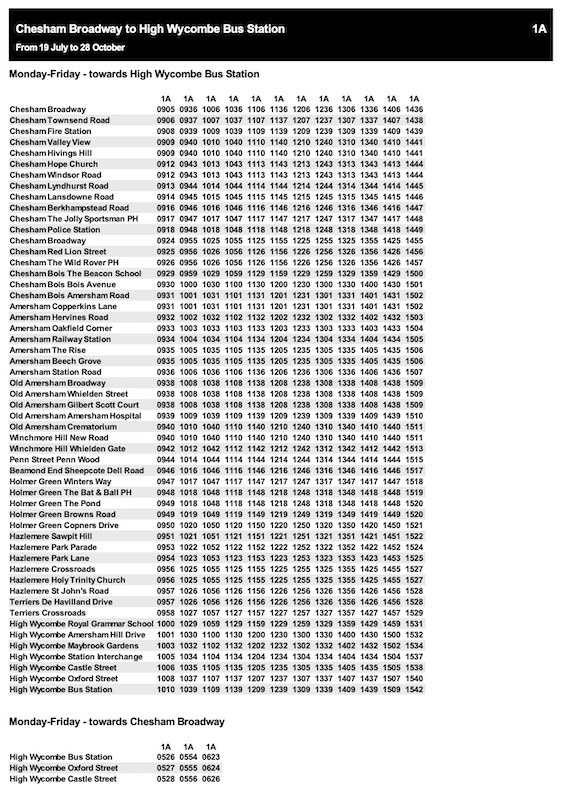 You’d be forgiven for thinking there’s no off peak service. But, of course for that, you have to know to click on route 1A (listed a long way from route 1 – see above) which also lists peak time journeys as well as all the daytime journeys every half an hour, as they’re 1A rather than 1. Anyone who knows anything about buses and timetables would have immediately spotted the need to combine the 1 and 1A timetable into one presentation. This is pretty basic, kindergarten stuff. All the more so, as in the opposite direction buses heading towards Chesham in the off-peak every half an hour are numbered 1 and not 1A, so the opposite holds true.