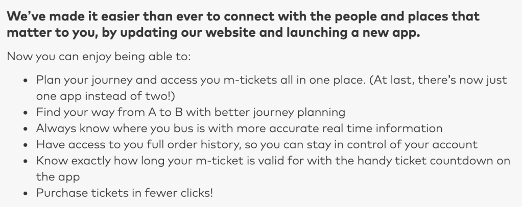 Yes, the timetables are dreadful – but it’s not 1974, anyone not in the bus industry is using google to plan their journeys on their phone. Mobile first presentation, journey plans and mobile ticketing are where it’s act. And from that viewpoint, this site is objectively spot on.