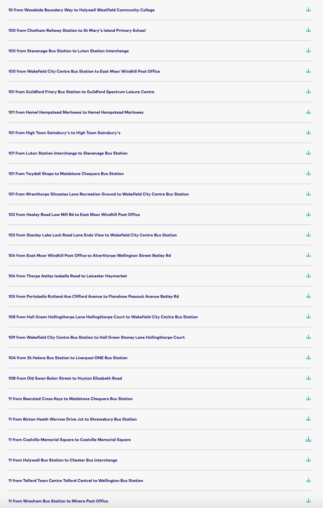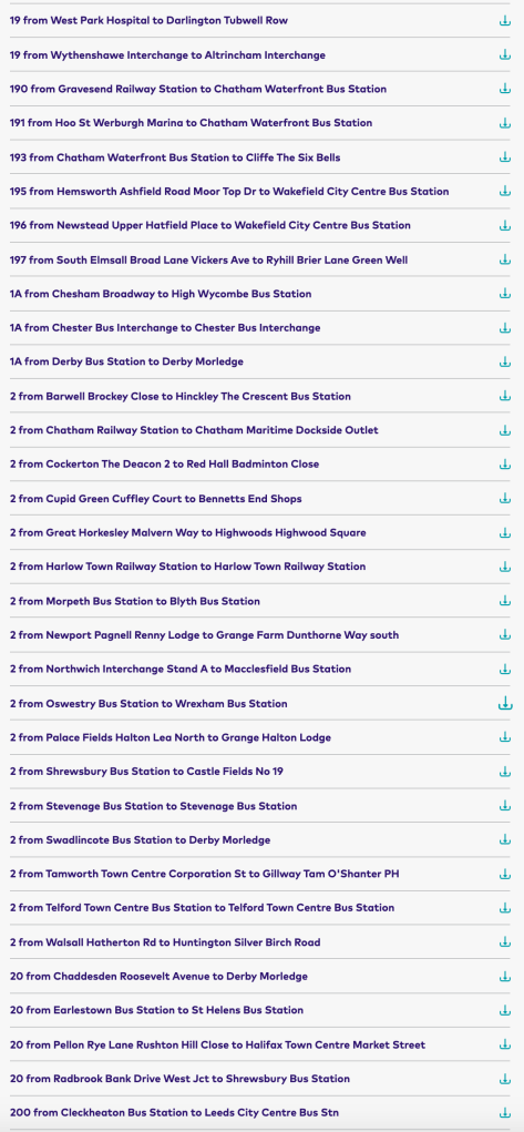 Click on ‘Download timetables’ and you get a quite mind boggling listing of every bus route Arriva operates in route number order – except not route number order as you and I would understand – no, this is route number order as though we are computer language geeks.