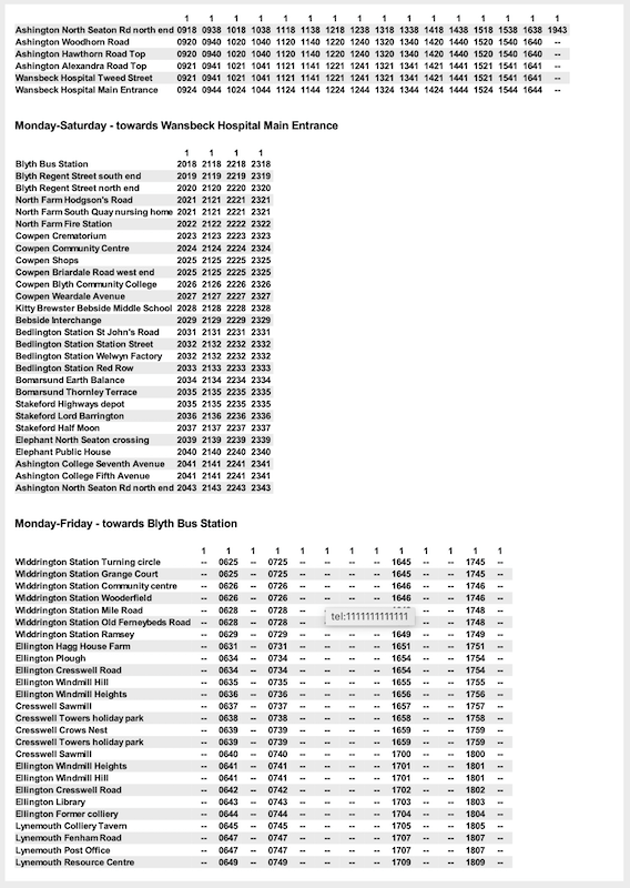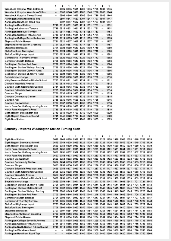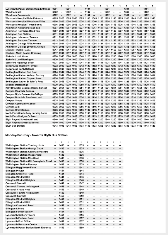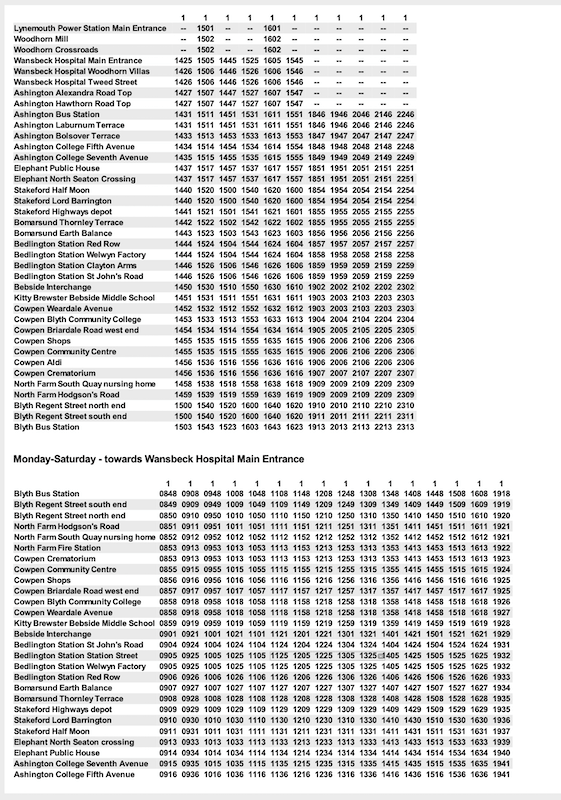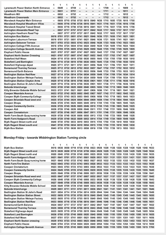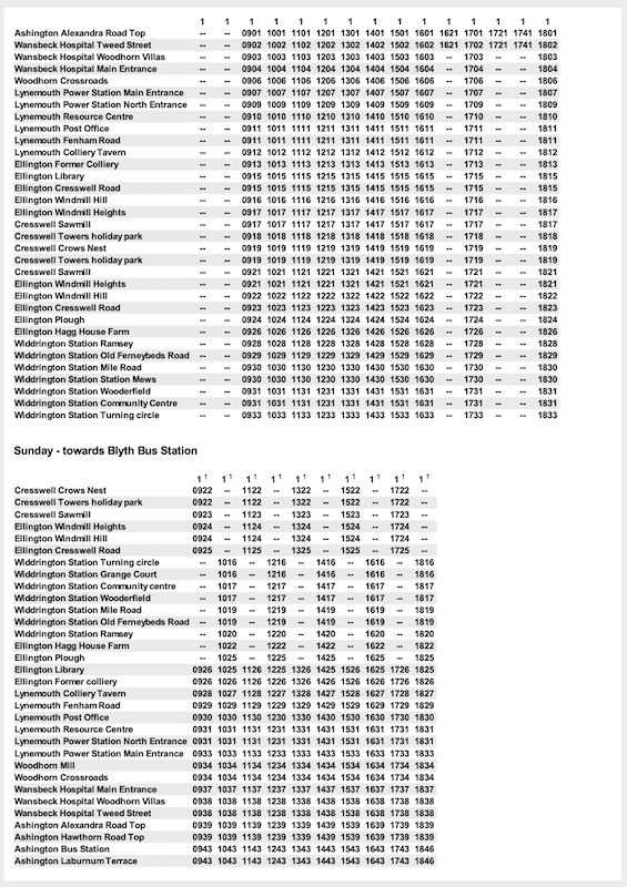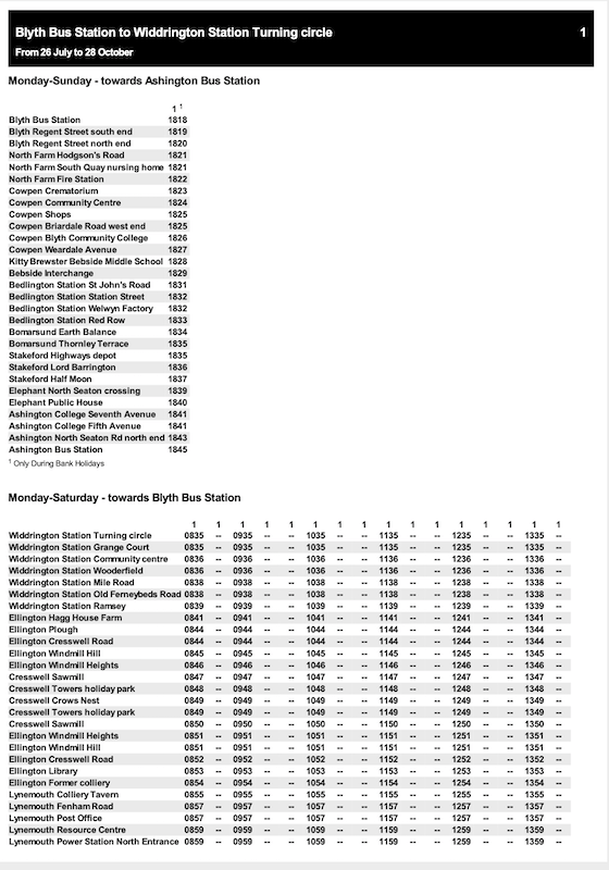 Some timetables, if they have different journey patterns in the evening or at weekends have a nonsensical presentation. For example, take the very first route listed – route 1 Blyth to Widdrington Station.