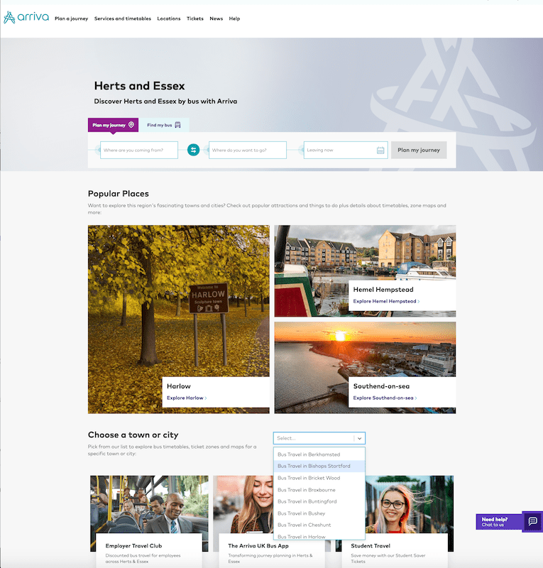 There is what could be a useful option in ‘Search below to see where Arriva buses are near you’. But unfortunately, unless you live at the terminus, your local route won’t be found. Fine if it’s your local route, but suppose you’re on holiday and don’t know the local buses? Surely a site should provide help to people who don’t already know the answer?
