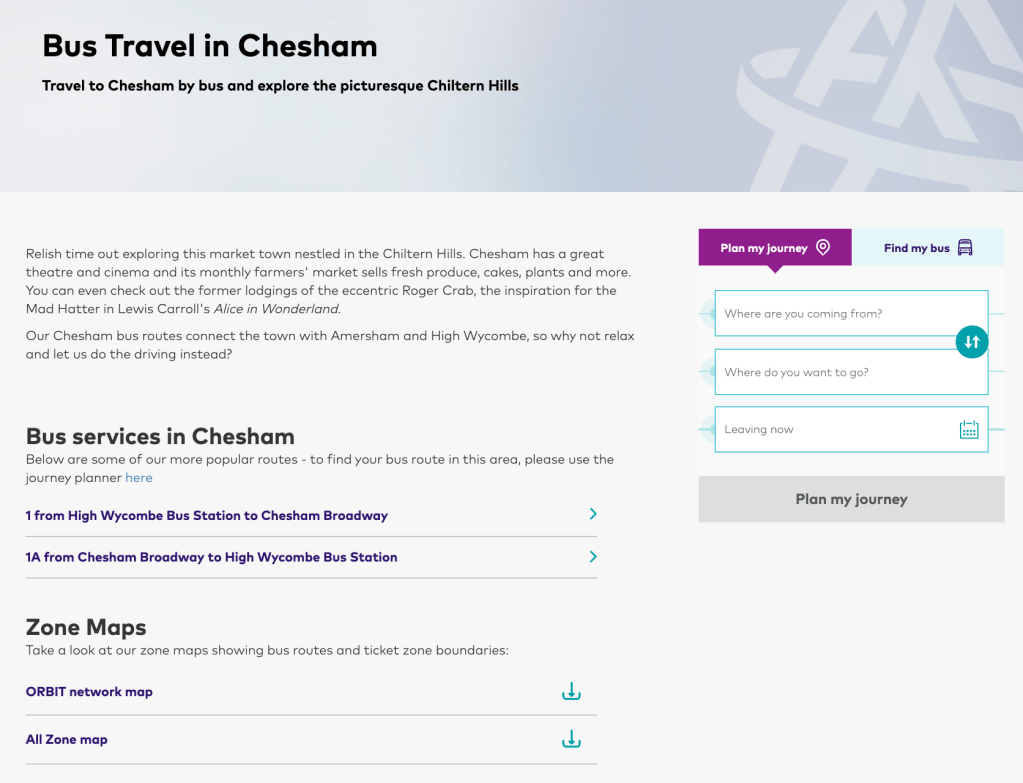 This brings up a selection of “Bus services in ….” and the words “Below are some of our more popular routes ….” which is a bit odd when in some areas only one (or two) route/s are listed as popular! For example, Chesham – the infamous 1 and 1A are listed along with a description of the delights to be found in Chesham as happens with each location – and which pretty much read the same for every place, other than the detail of theatre names being different.