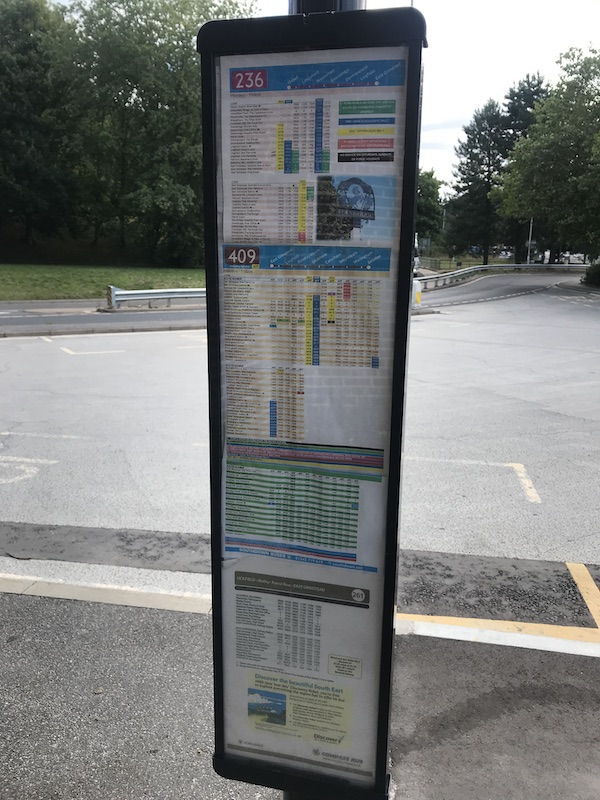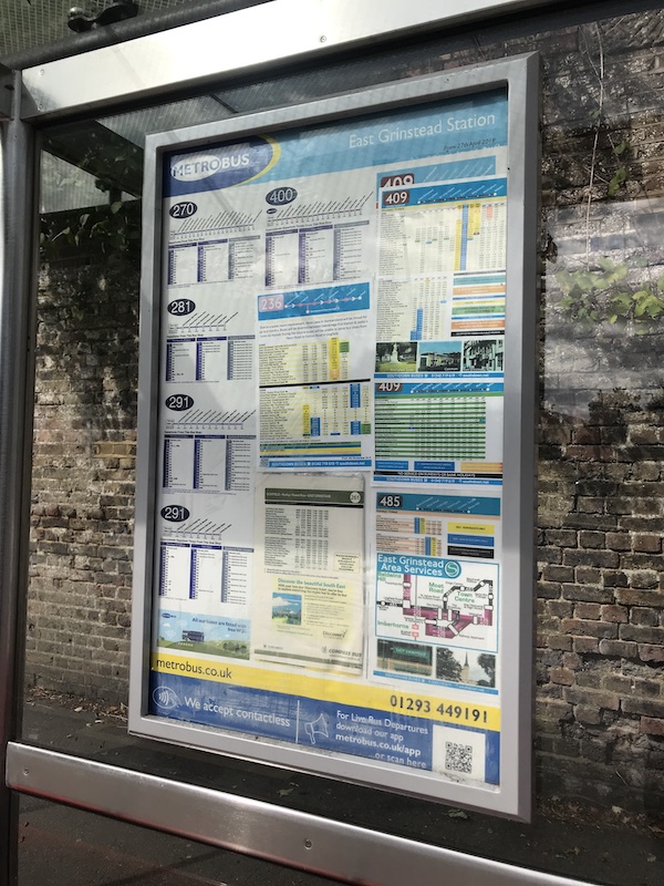 There were also timetable displays for Metrobus, Southdown and Compass Bus albeit a little untidy, but at least every route is on show with some displayed twice….