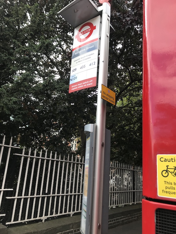 Looking up route 405 on TfL’s website also confirmed the 405’s first stop was Park Street so I returned there and despite there being no reference to 405 on the flag or in the timetable case – which was mostly blank anyway – I waited with some trepedation along with many other passengers with pretty much no regard for social distancing at a stop which was busier with all the departures now timetabled than the one in Katharine Street.