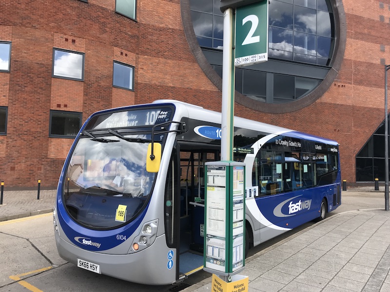 Metrobus hourly route 400 is the direct and quickest journey from Redhill to Crawley taking 36 minutes with just one small deviation to serve East Surrey Hospital a short distance off the A23, but I opted for the 20 minute frequency, ‘fastway’ branded route 100 which wanders off the A23 to serve Meath Green, Horley, part of Gatwick Airport’s perimeter road and Crawley’s Manor Royal Business District – which was eerily quiet as we passed through. This journey takes 54 minutes, but I wasn’t worried about timings as my next journey south from Crawley on the infrequent Brighton bound 273 wasn’t leaving until 16:30.