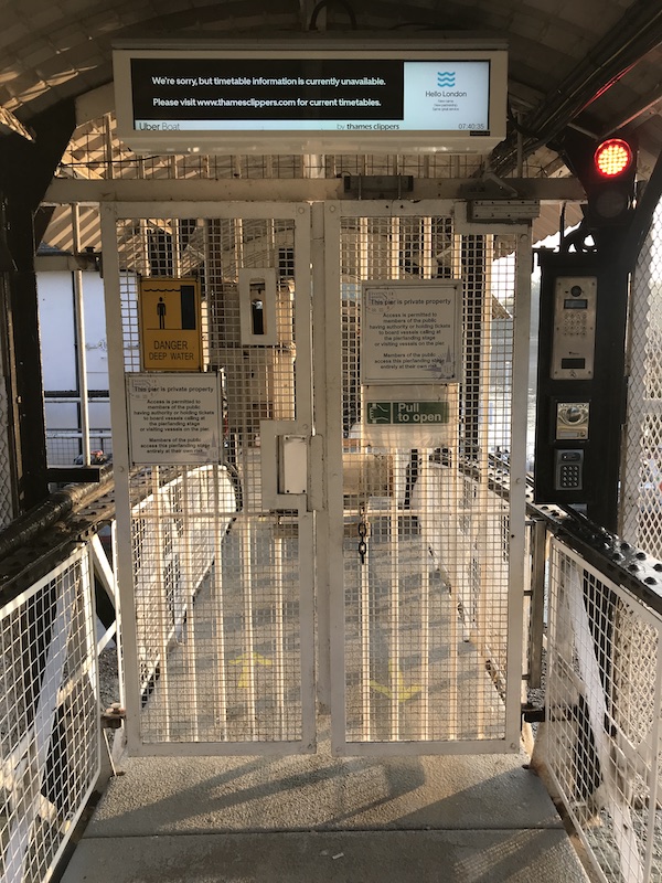 I arrived in good time at Putney Pier about 07:35 and as the 07:30 sailing had not long departed, unsurprisingly no-one else was around. The pier isn’t manned and has a gate at street level which is locked shut with a red traffic light just to emphasis you’re not allowed down to river level.