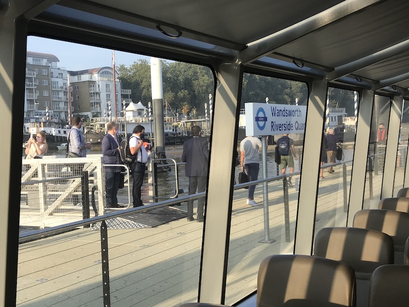 Seven minutes later we’re mooring up at the first pier at Wandsworth where 15 passengers board in an orderly single file. It takes less than a minute and we’re off again heading towards the next pier called Plantation, seven minutes further on, where four more come on board.