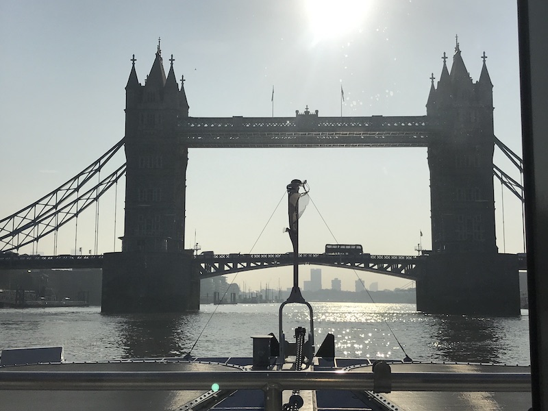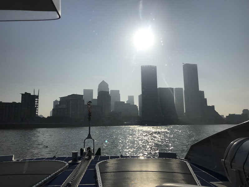 We cast off (is that the right term?) at precisely 08:05 and headed east along the absolutely still and beautifully calm River Thames with the sun shining brightly ahead of us on a glorious morning. What a wonderful way to begin your daily commute.