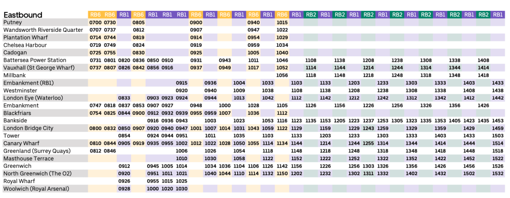 There are six morning departures from Putney Pier. The first two (07:00 and 07:30) go as far as east as Surrey Quays the next two (08:05 and 09:00) terminate at the previous pier at Canary Wharf, while the last two (09:40 and 10:15) go further, to North Woolwich. All RB6 journeys stop at every pier as far as Vauxhall and then skip piers just stopping at the commuter hot spots at Embankment, Blackfriars and London Bridge.