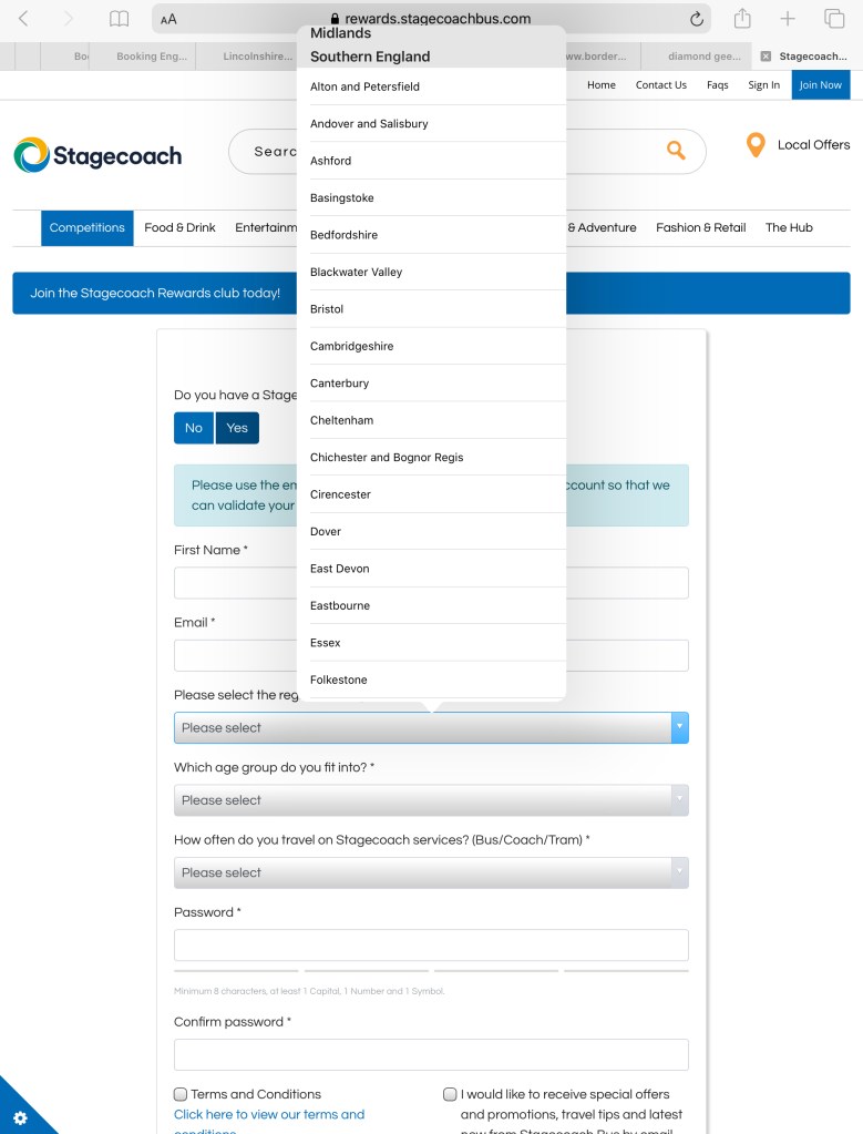 Stagecoach reckon members will enjoy exclusive deals on “day to day activities local to you”. To facilitate this you’re given page after page of towns and cities by region in a drop down menu on signing up to specify a location local to you. I ticked ‘Worthing/Brighton’ and looked forward to all the “me-time treats” I’d be able to “start saving straight away”.