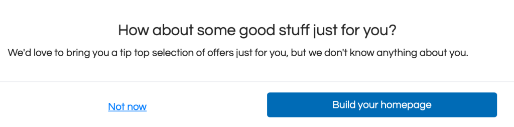 I was also invited to “select your preferences” as “we’d love to bring you a tip top selection of offers just for you, but we don’t know anything about you“.