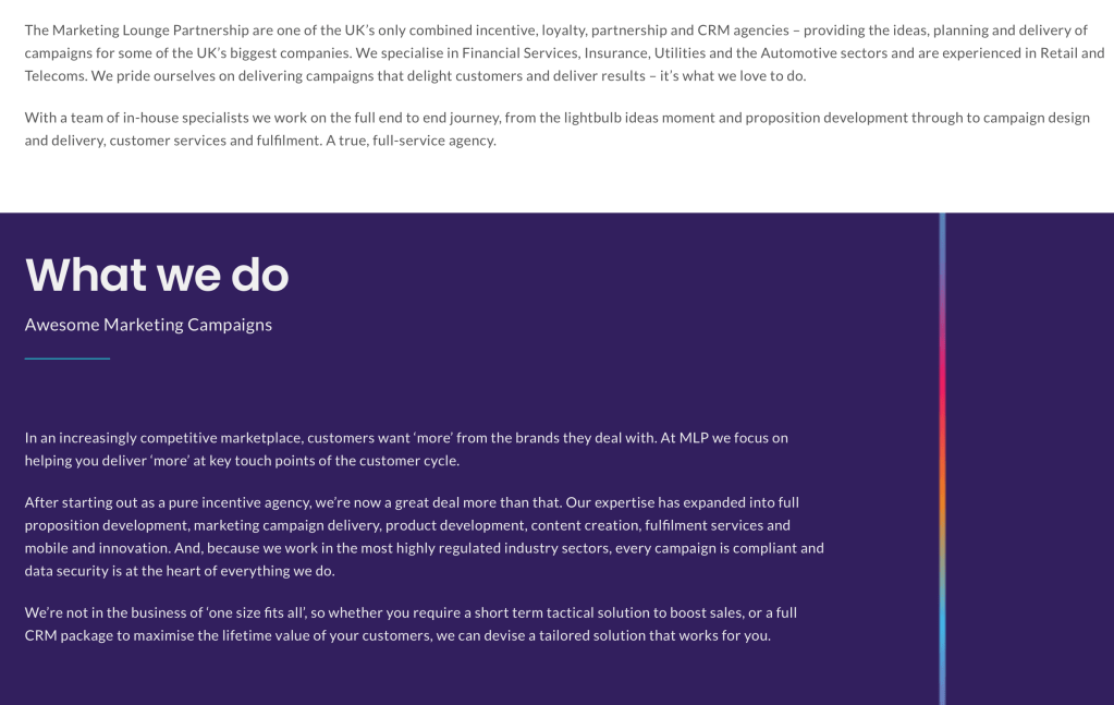 According to its website, the Marketing Lounge Partnership (MLP) is“one of the UK’s only combined incentive, loyalty, partnership and CRM agencies” which struck me as odd. It seems double dutch to say you’re ‘one of the only’ of anything. Either you’re ‘one of a few’, or you’re ‘the only’. Surely?
