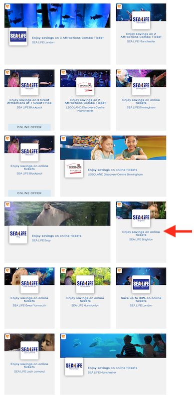 I checked out the Sea Life Centre Brighton website and could buy an Adult and Child ticket for £14 (“Online exclusive”).