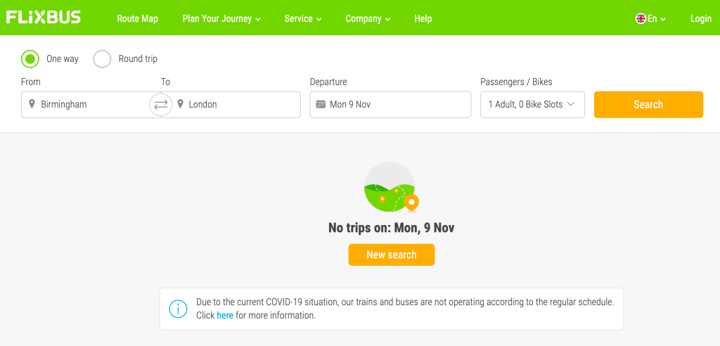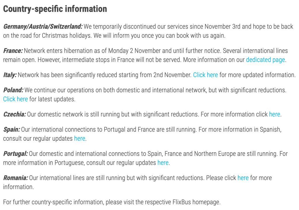 And rather oddly by clicking on the link for more information brings up the rather depressing travel restricted situation across much of Europe, but no information about the UK – I know we’ve left but, come on FlixBus, don’t rub it in by ignoring us.