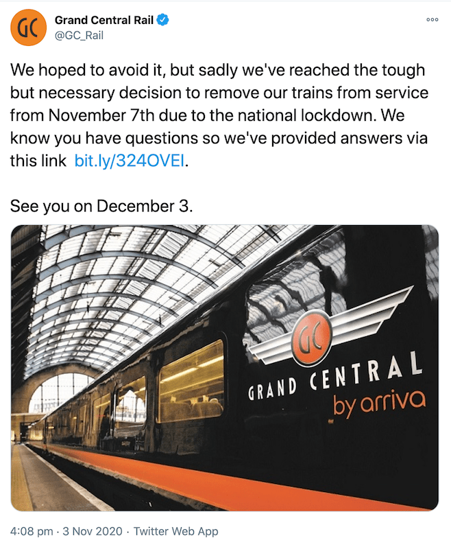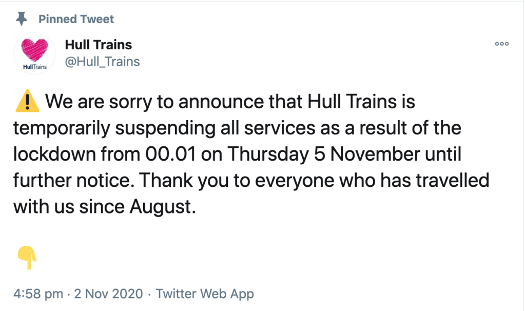 Well, Grand Central has with their optimistic (and let’s hope not misplaced) “See you on December 3” sign off, whereas there’s no such indication of when Hull Trains might be back on track.