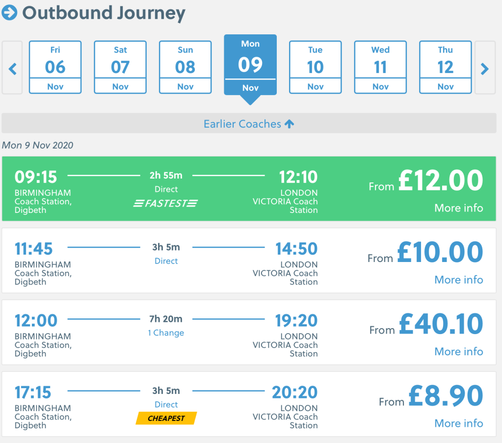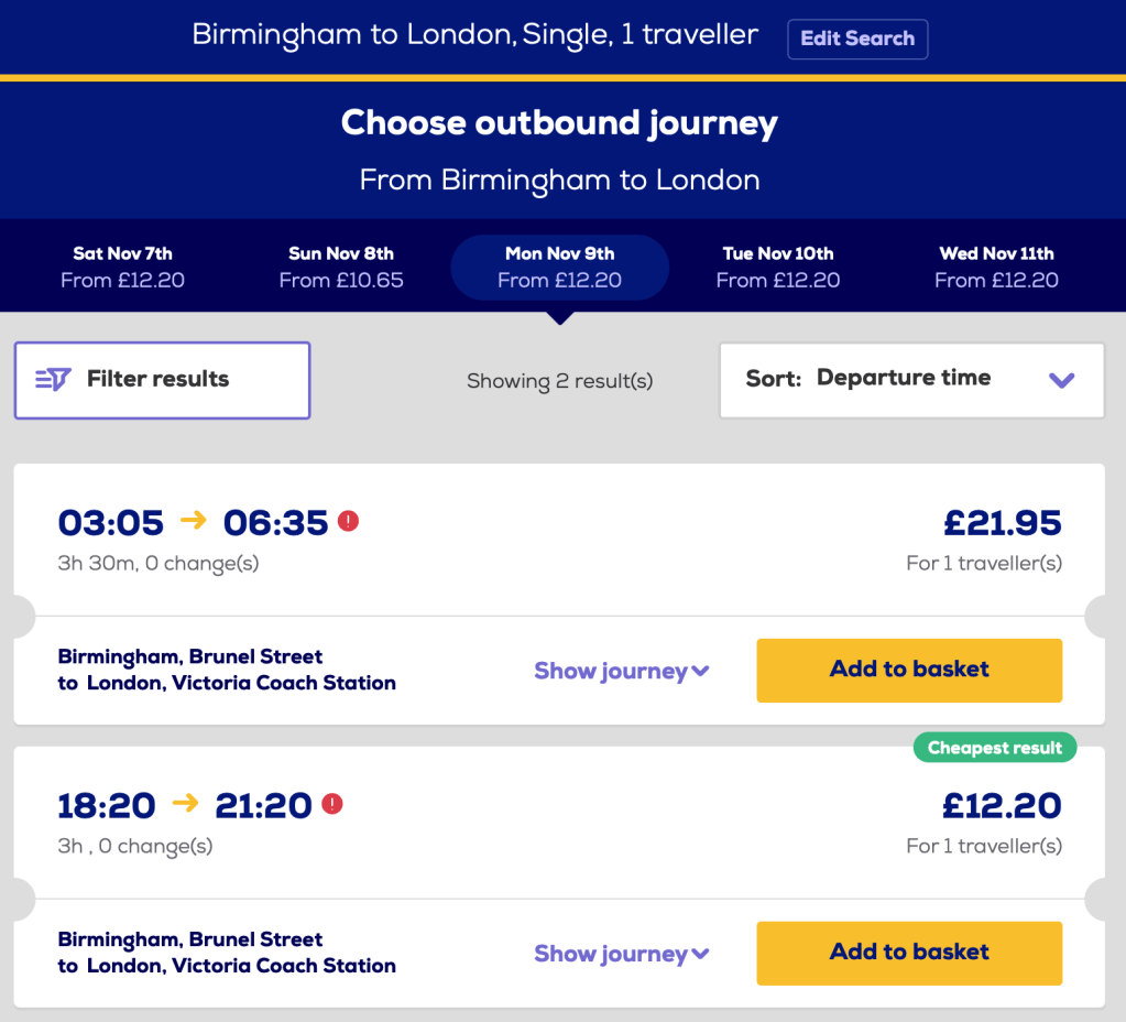 Trying that journey from Birmingham to London on Monday brings up just three direct journeys on National Express and a rather bizarre “1 Change” option…