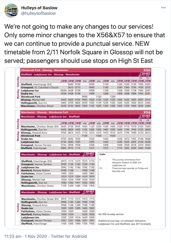 On the positive news front, I see Hulleys of Baslow are still committed to their new route X57 across Snake Pass despite lockdown although an updated timetable is now in operation as tweeted last Sunday for improved timekeeping, including eliminating that loop around Norfolk Square in Glossop which I suggested in my recent review.