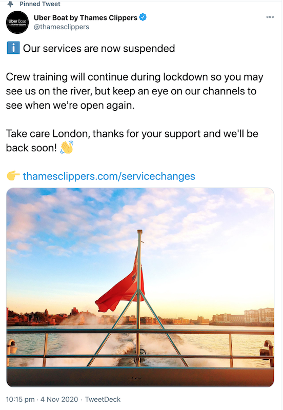 Thames Clippers have also dropped anchor for lockdown – so that’s worked out well for Uber’s sponsorship then.