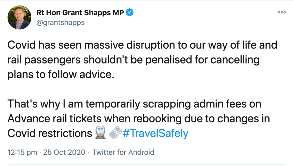 However, it was good news Shapps announced on his Twitter account (!) refunds will be given on Advance Tickets – and just in the nick of time too with lockdown restrictions meaning many travel plans have now had to change.