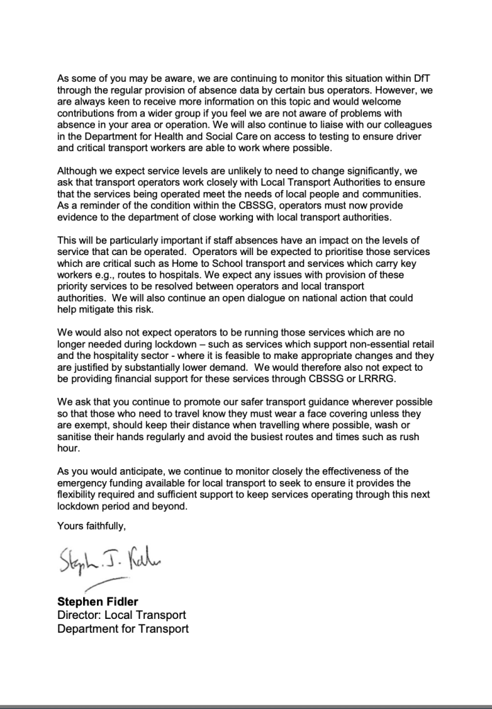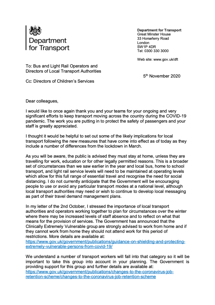 DfT’s Director of Local Transport, Stephen Fidler, wrote to all bus and light rail operators on Thursday indiciating service levels should remain unchanged. He wrote: “As you will be aware, the public is advised they must stay at home, unless they are travelling for work, education or for other legally permitted reasons. This is a broader set of circumstances than we saw earlier in the year and local bus, home to school transport, and light rail service levels will need to be maintained at operating levels which allow for this full range of essential travel and recognise the need for social distancing. I do not currently anticipate that the Government will be encouraging people to use or avoid any particular transport modes at a national level, although local transport authorities may need or wish to continue to develop local messaging as part of their travel demand management plans”.