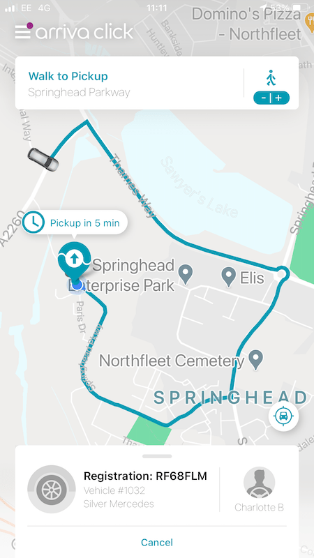 This minibus was lurking at Ebbsfleet International Station and set off immediately to pick me up offering just a convenient five minute wait. I was a bit surprised to see it was taking the previously required circuitous route to where I was waiting rather than use the new bridge, thinking maybe the software hadn’t been updated, especially as it didn’t show up on the map (it’s located underneath the words “Pickup in 5 min” shown below)