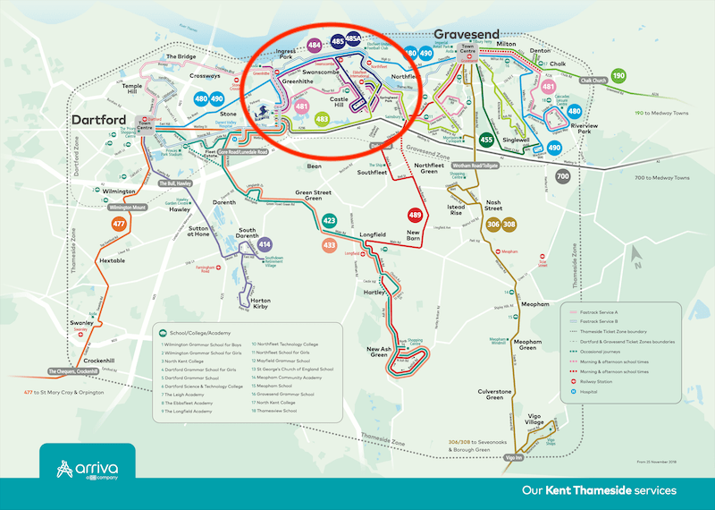 Until Monday the residential development in Ebbsfleet Valley had been served by daytime route 484 operated by Arriva between Bluewater, Greenhithe and Ebbsfleet on a rather unmemorable 65 minute frequency during the day with morning peak and evening journeys as route 485/A on a circular route around the residential estate (clockwise and anti-clockwise) to Ebbsfleet and Swanscombe stations on a 17 and 28 minute frequency – yes, I know, hopeless.