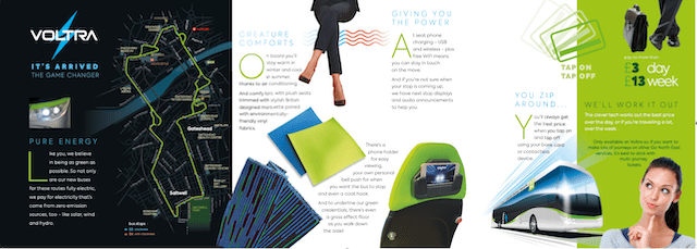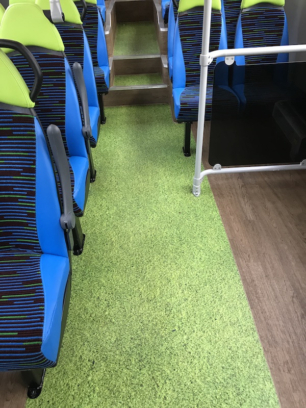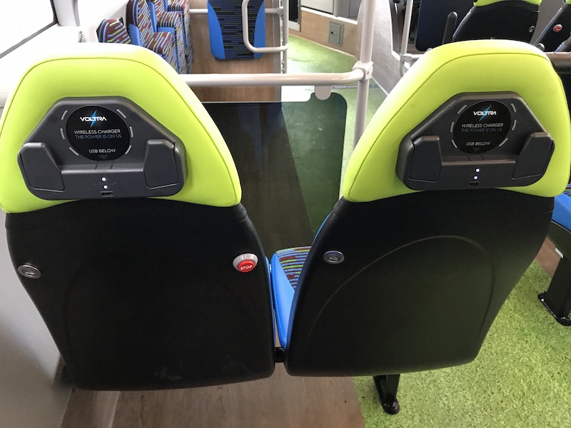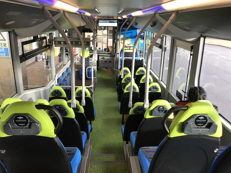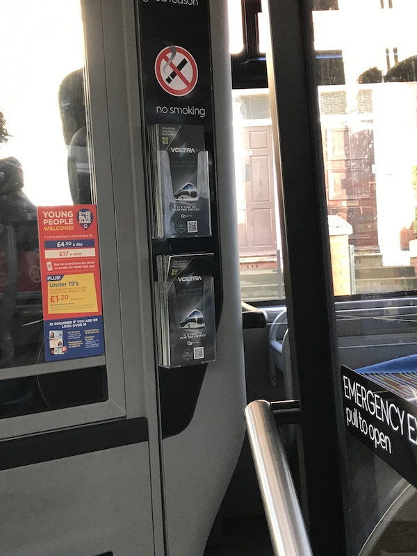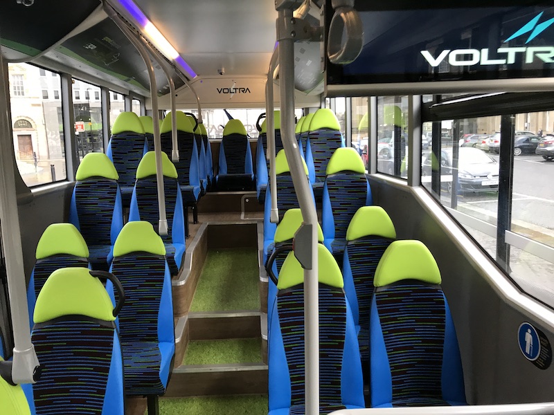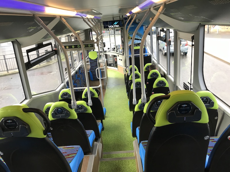The Voltra brand name does feature inside the buses and this has connotations of electricity – voltage – and there are rightly references on the outside of the bus telling the wider community of its emission free status.