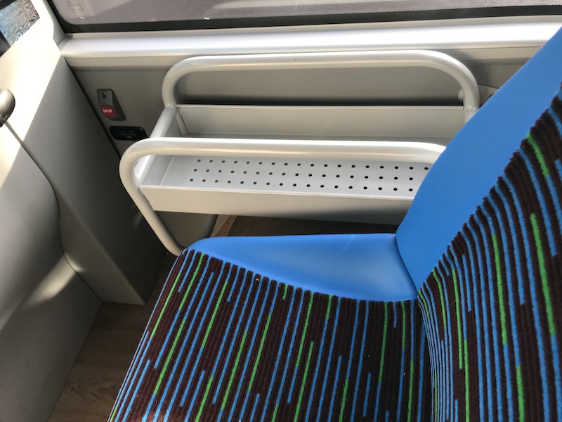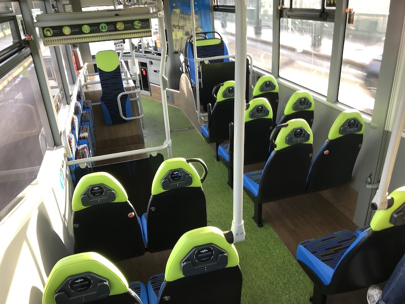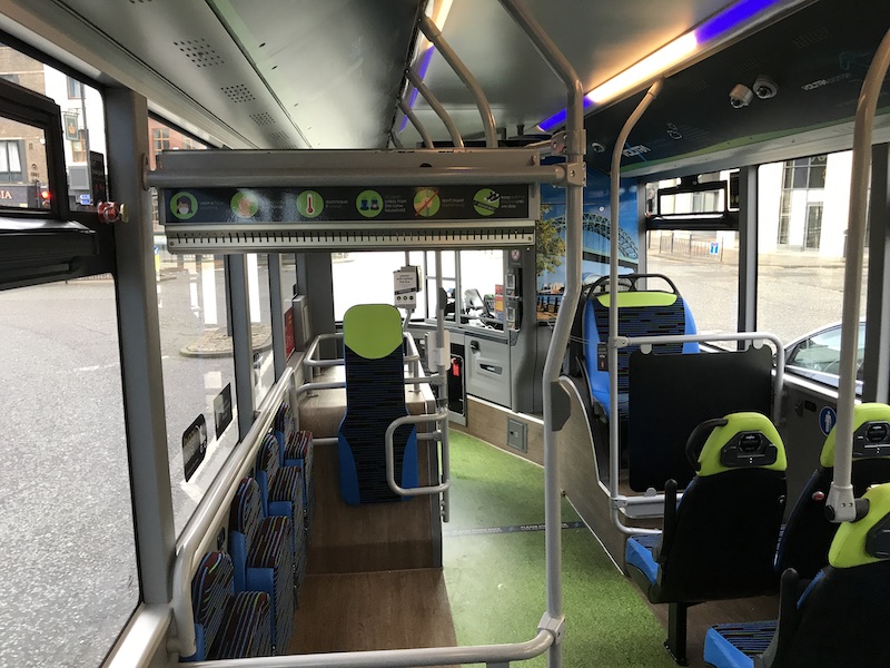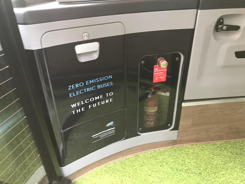 I was also struck by the absence of lots of shouty notices inside telling me how much carbon I’m saving by making a journey on an electric bus or similar exhortations, the main reference I spotted was as you board by the driver’s cab door and some subtle information on the well designed cove panels.