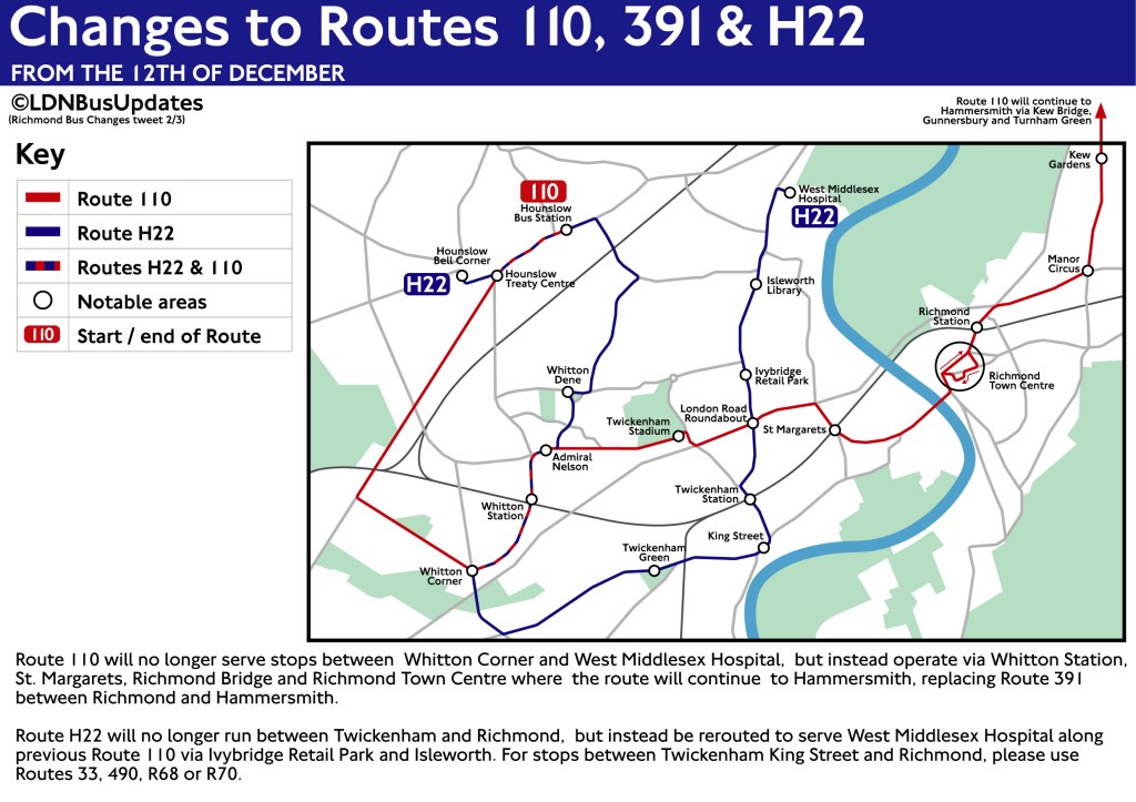 Biggest makeover is to route 110 which has been transformed from a backwater 20 minute frequency U-shaped route running between Hounslow and West Middlesex Hospital taking 42 minutes via Twickenham to more than double its length by subsuming part of route H22 (from Twickenham to Richmond) and a full takeover of route 391 (which has now disappeared) between Richmond via Kew and Chiswick to Hammersmith where it now terminates. New end to end journey time is more than double at around 90 minutes and the frequency is now every 15 minutes.