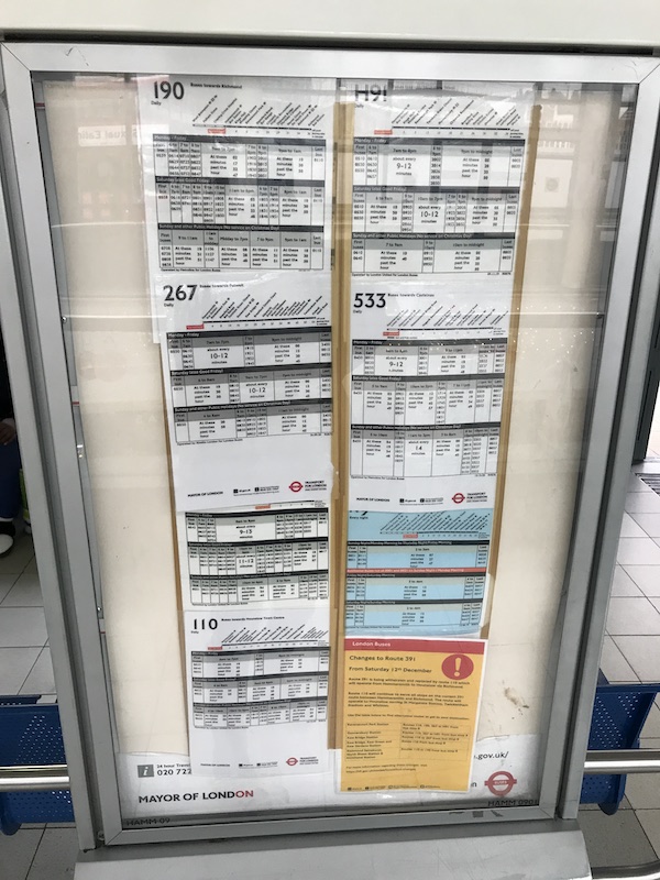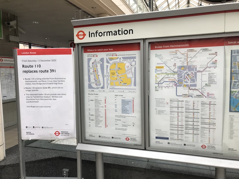 Even spider maps had mostly been updated and on display in bus shelters, and at Hammersmith bus station there was even a large poster explaining the change to route 391 being usurped by the newly extended route 110.