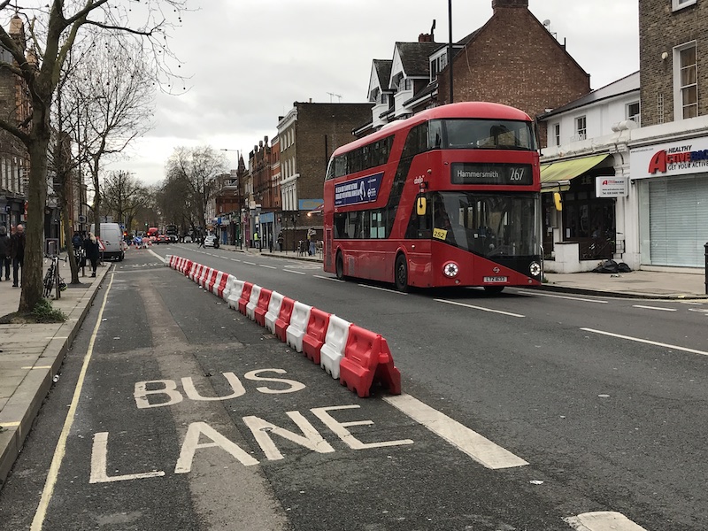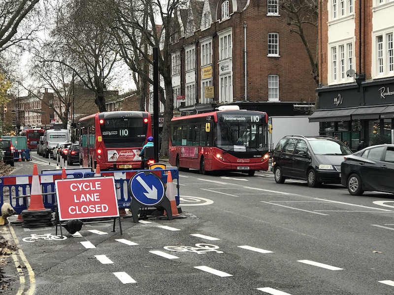 Chiswick High Road has got a reputation for traffic delays but it was free flowing when I passed through today – but it’s a shame to see the westbound bus lane has been taken over for a temporary cycle lane.