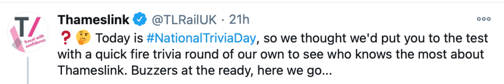1. I do have to disagree with you about the Twitter teams doing questions for national trivia day – in my opinion, anything like that which the social media teams are making up in their spare time is great.