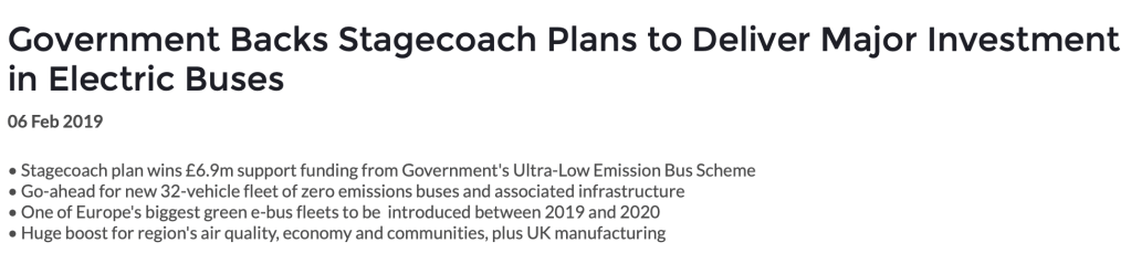 It’s not clear what became of the 2020 ‘New Partnership Plan’ but checking further back I see another high profile plan was announced by Stagecoach In February 2019 to “deliver one of Europe’s largest single investments in electric buses for Greater Manchester after winning £6.9 million in support funding from the Government”.