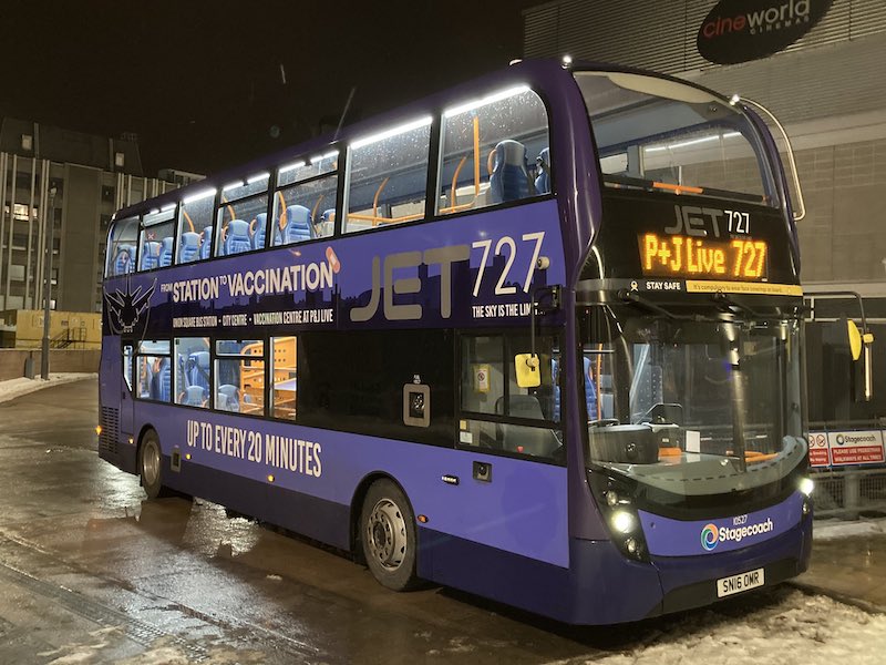 Handy that the mass vaccination centre in Aberdeen – located at the vast P&J Live events venue is on the Stagecoach route 727 between Aberdeen Airport and city centre, giving the 20 minute frequency route – which runs between 04:00 and midnight – a boost to passenger numbers while the airport continues to be devoid of passengers.