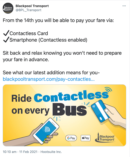 Smart ways to pay for on-board bus fares are expanding with Blackpool Transport getting excited it had got round to adding contactless as a payment option on its buses (not trams yet) from Sunday …. (btw, trams haven’t been running this week due to essential track maintenance works, with a reduced service operating next week) ….