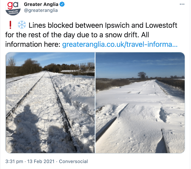 Thirdly, an addition to the impact of Storm Darcy and the week of snow, here’s what faced Greater Anglia last Saturday on the Ipswich to Lowestoft East Suffolk line; it’s quite some snow drifting (and a nice photographer shadow too) …
