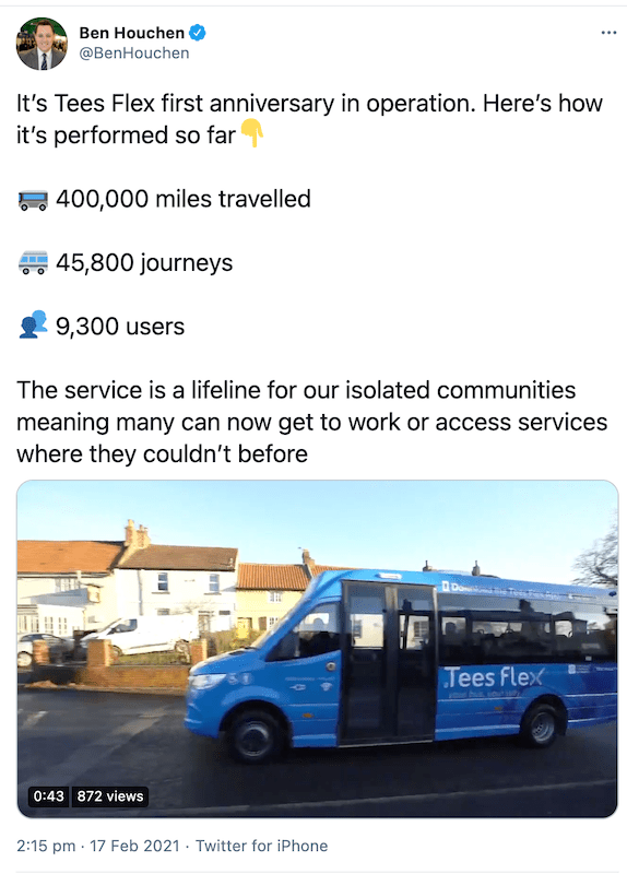 And a muffled shout out to Tees Flex which marked its first anniversary this week with a promo video tweeted by Tees Mayor Ben Houchen who gave some statistics which are pretty meaningless out of any context. The “9,300 users” quoted are the number who’ve downloaded the app, so aren’t necessarily active users – I haven’t used the service since its first day a year ago, for example. Each journey averages almost nine miles according to the figures which seems almost unbearably long for a local bus operation but possibly reflects the rural nature of Tees Flex. Still unbelievable to me though.