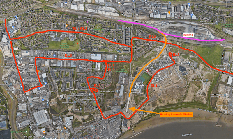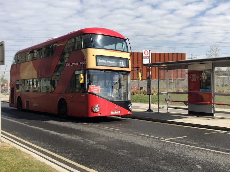 Route EL1 runs from Ilford and Barking and originally terminated at the eastern end of Bastable Road before being extended to Barking Reach in September 2013, which was then the southern edge of the Riverside development. As new roads took shape and more homes built it was extended again to a newly established terminus at Barking Riverside in November 2018. Route EL1 runs at a very generous frequency of every 5-6 minutes pretty much all day widening to every 10 minutes in the evening and half-hourly all through the night.